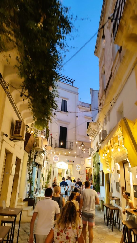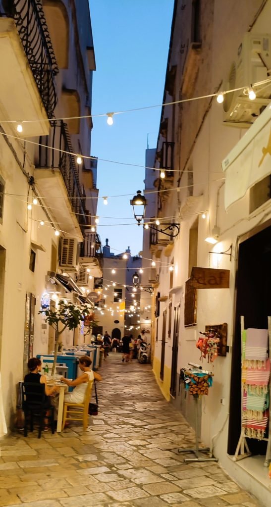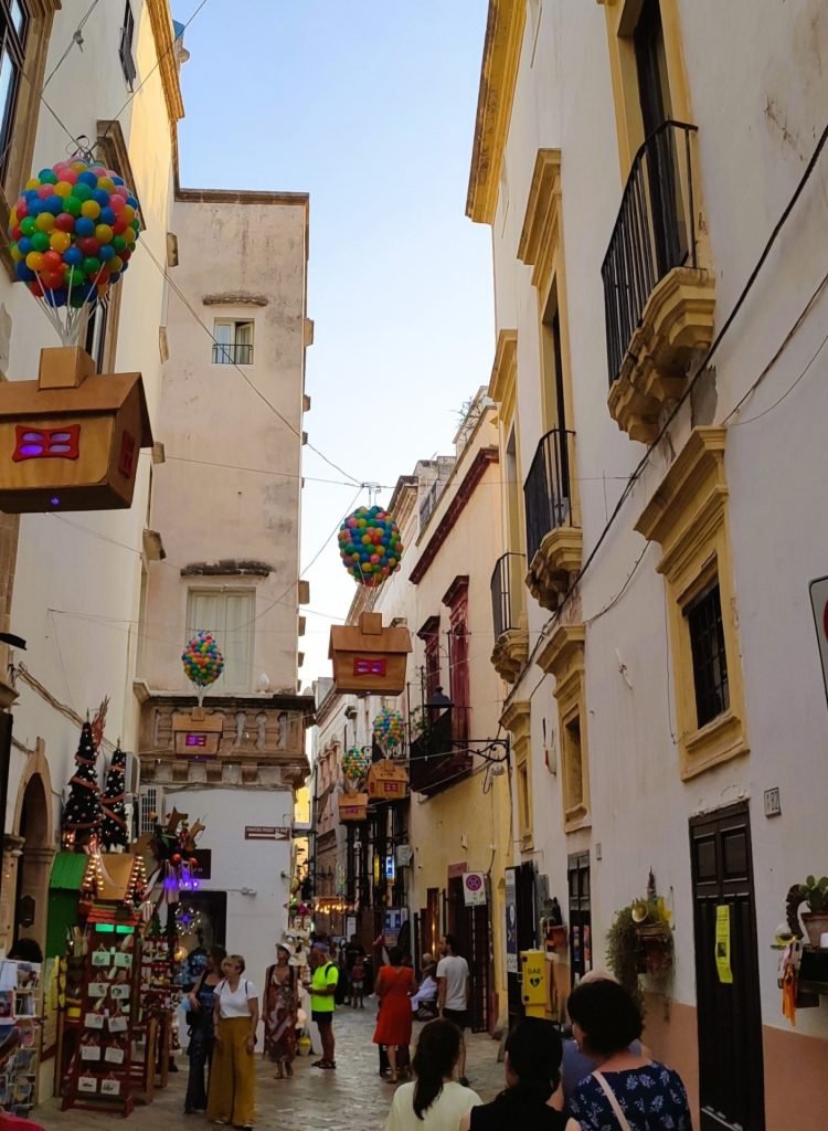 Via Antonietta de Pace este principala stradă și intrarea în orașul vechi Gallipoli (detalii, aici), o arteră animată, cu o atmosferă turistică vibrantă, plină de viață mai tot timpul, având și o înfățișare pe măsură: strălucitoare, luminată și decorată astfel încât să pară cât mai primitoare, chiar și cu personaje și decoruri din desene animate, chiar și cu o căsuță a lui Moș Crăciun, dulce și cât se poate de deschisă în plină vară, dar și cu multe prăvălii, magazine de suvenire și terase cât vezi cu ochii.